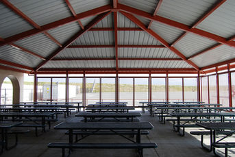 Our metal roof structures provide very attractive (no exposed bolts, bird nesting spots or galvanized I beams here) all weather protection and long term durability.